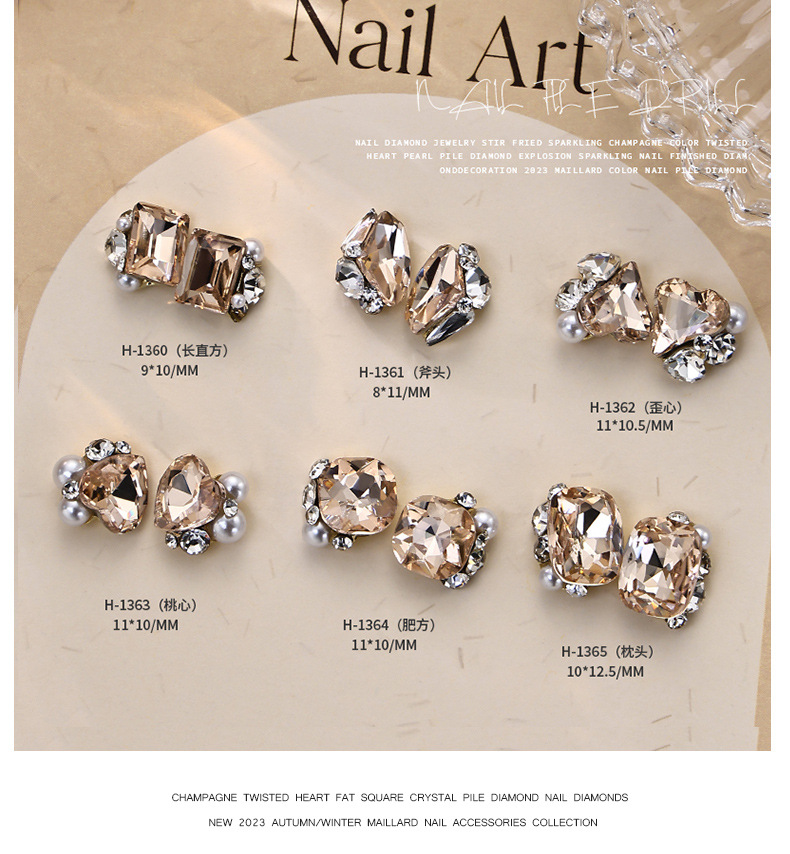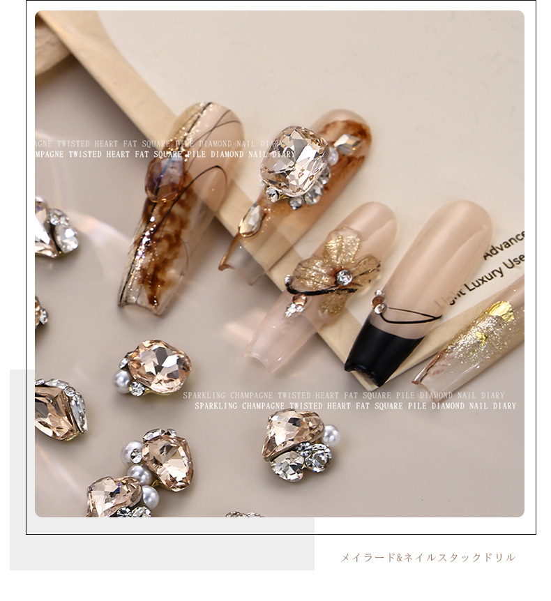 Net Red Maillard Crystal Pile Diamond Finished Explosive Nail Jewelry Super Flash Light Coffee Color Crooked Heart Three-Dimensional Nail Drill